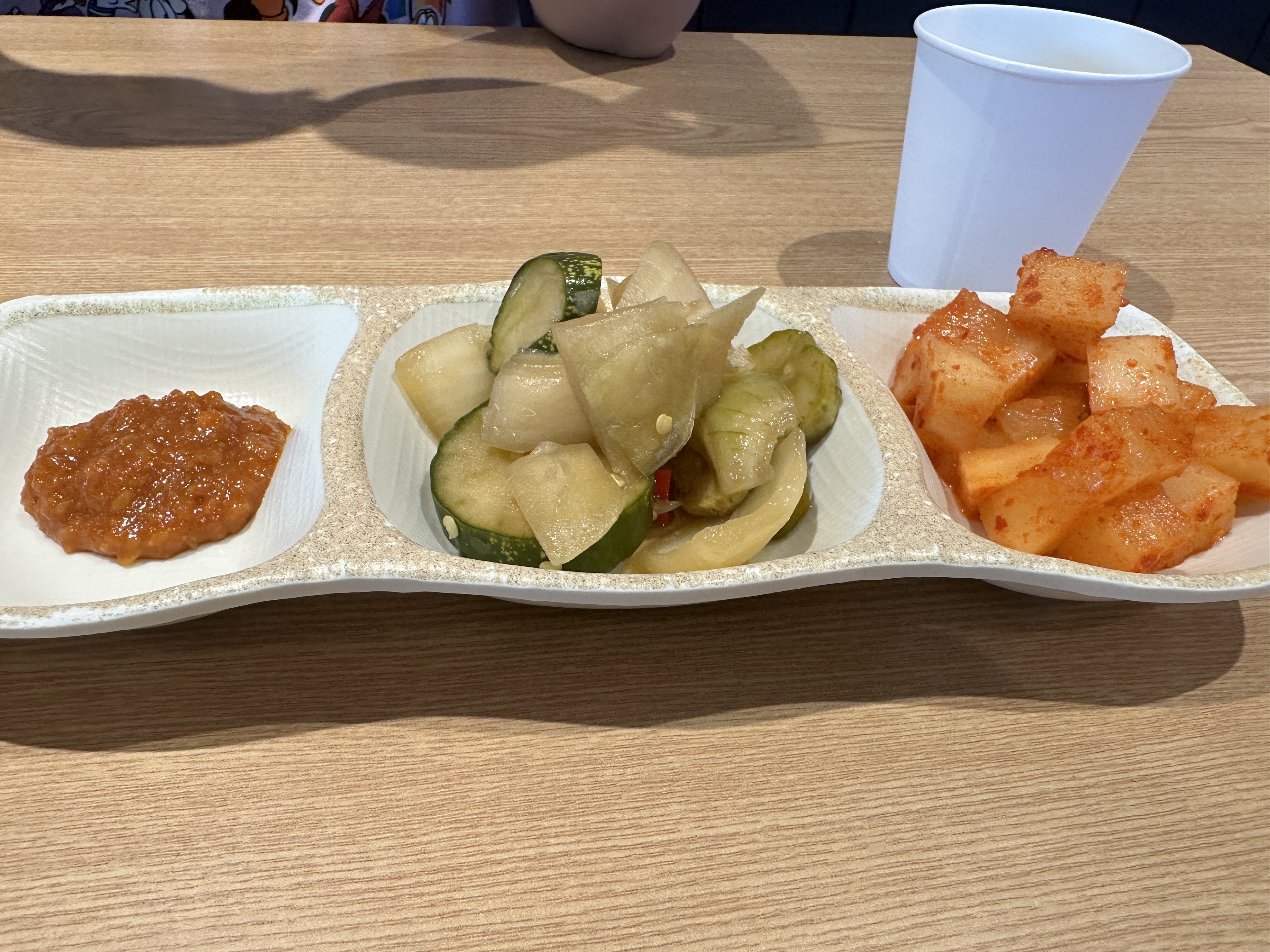 양파, 오이피클, 깍두기, 청양고추 등의 기본 찬이 제공되며, 국물과 스프도 셀프바에서 이용할 수 있습니다. 전체적으로 돈까스와 잘 어울리는 구성이었어요.