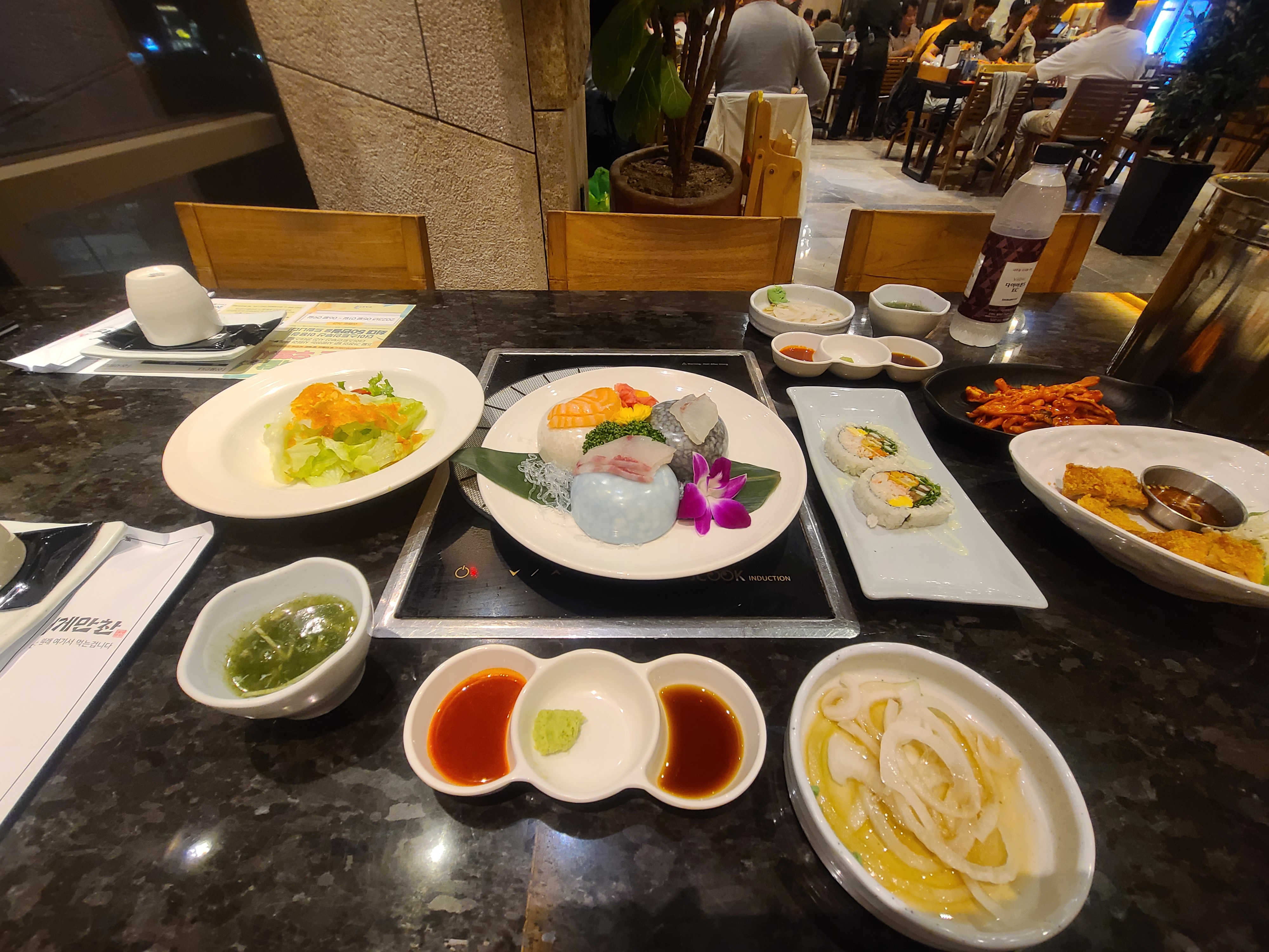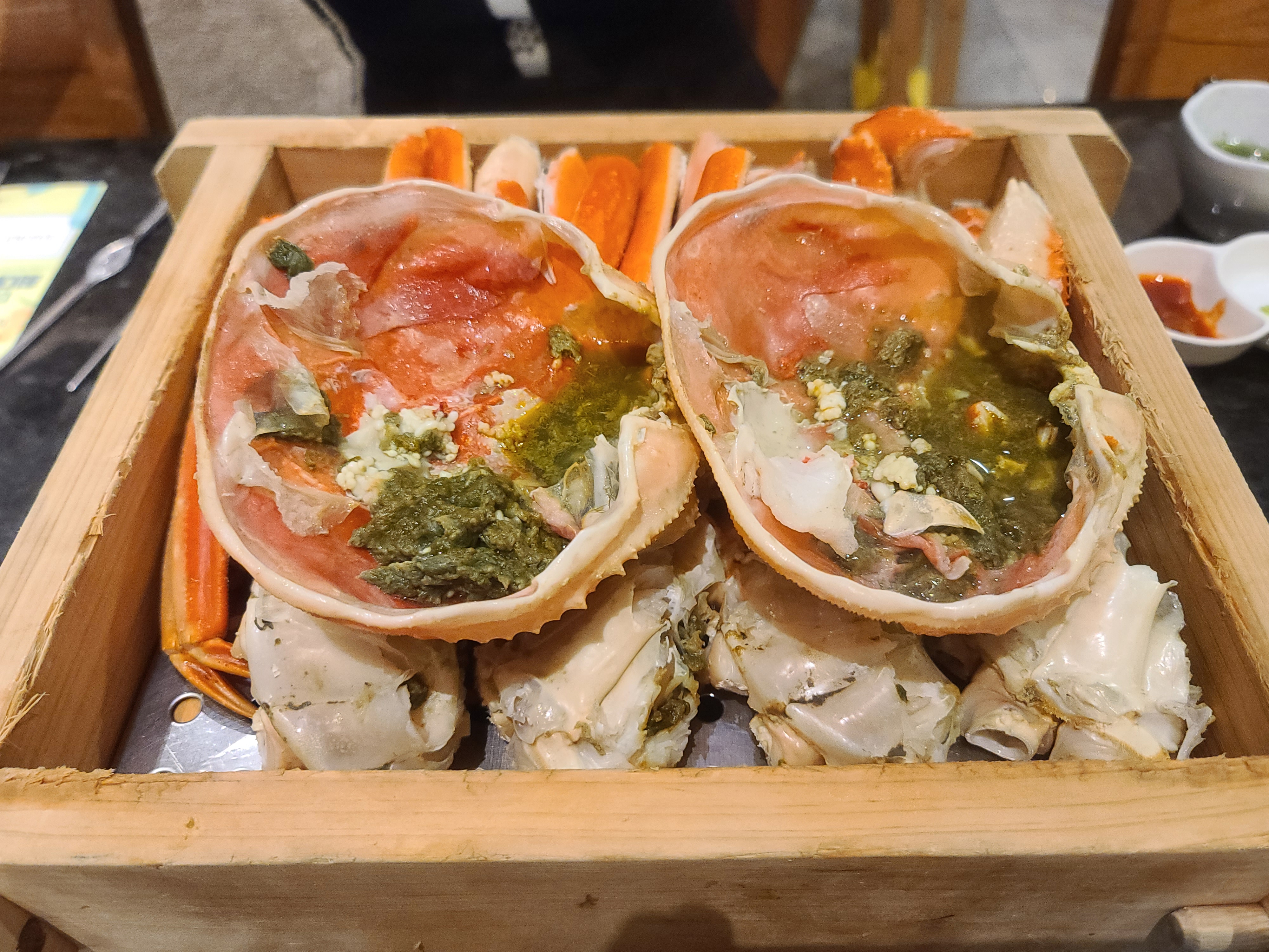 오늘의 주문은 대게 2.5kg + 물회 +된장찌게를 주문하였습니다. 보통 2명 기준으로 2.5kg 이내로 먹는다고 합니다. 대게찜이 나오기 전에 회와 간단한 음식들이 준비됩니다. 회, 마끼, 샐러드, 돈가스 다 조금씩의 맛보기로 나옵니다. 대게가 쪄지는데 시간이 걸려서 조금 시간이 걸리는 것은 감안하고 가져야 됩니다. 대게 맛은 다 똑같겠지만 가득한 육즙이 맛을 풍미를 더했고 자주 접하는 음식이 아니다 보니 너무 정신없이 먹었던 기억이 나네요 다만 아쉬운 건 상차림을 따로 받고 있었고 좀 더 배부르게 먹어야 된다면 메뉴를 추가해서 먹어야 합니다. 물회랑 된장찌개 맛있었습니다. 된장찌개는 대게에 느끼함을 잡아주는 역할을 해서 조금 더 맛있게 먹을 수 있게 도와주었고 물회는 해산물들을 총망라해서 한입에 담을 수 있는 음식이었습니다. 혹여 가신다면 물회는 추천드립니다.