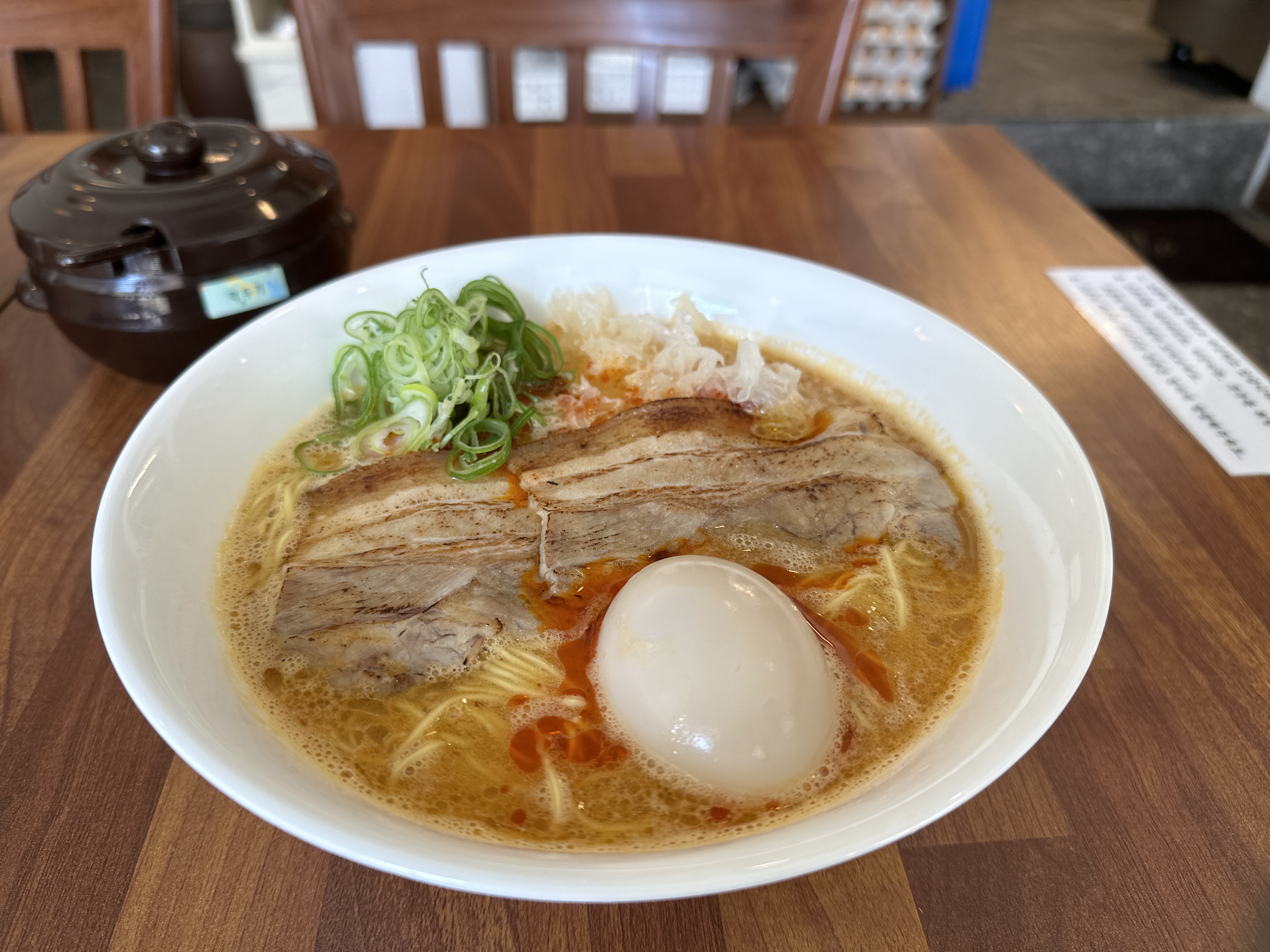 저는 돈코츠 시오라멘을 시켰습니다. 매운것을 좋아하긴 하지만 기본을 먹어 보아겠다는 생각이 들어서 먹었는데 면은 일반적인 라멘의 얇은 면이었고 육수가 아주 진하였습니다. 여기는 조금 특이하게 차슈가 조금 얇았습니다. 이것도 나름의 매력이 있었습니다. 면이 얇은 게 더 맛이 있는 것 같습니다. 챠슈와 같이 먹으면 일본라멘의 맛을 풍미를 잘 느낄 수 있습니다.