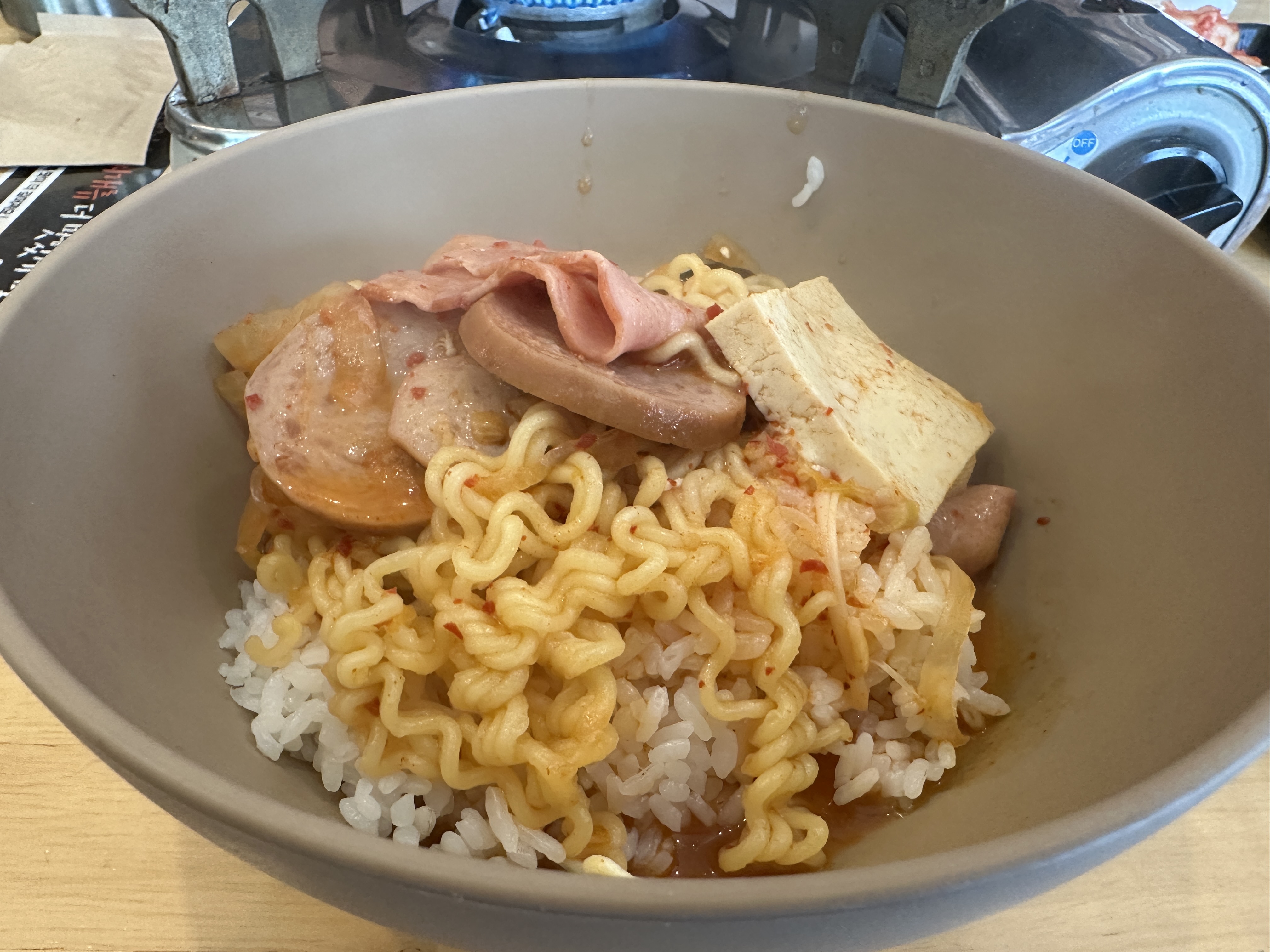 부대찌개는 밥에 말아 먹으면 더욱 진하게 느낄 수 있습니다. 보통 부대찌개집에서 먹는 것처럼 드시면 좋습니다.